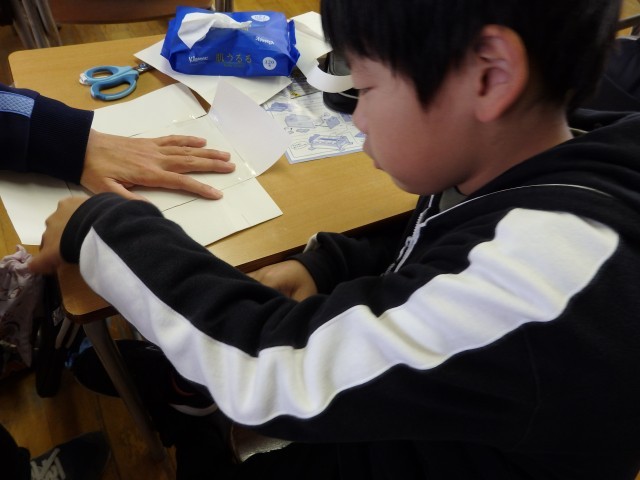 6年生の1時間目は学活の授業でした。学習発表会の準備をしていました。発表の時に使う大道具、小道具作りです。ツルハシや金塊、たらい舟など大小いろいろなものを協力しながら楽しそうに作っていました。「自分たちのアイデアで作ってるんですよ」とのこと。素晴らしい!