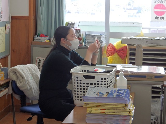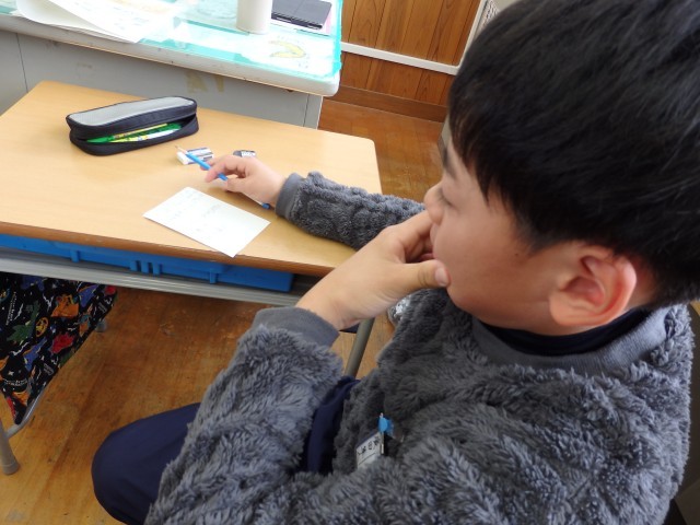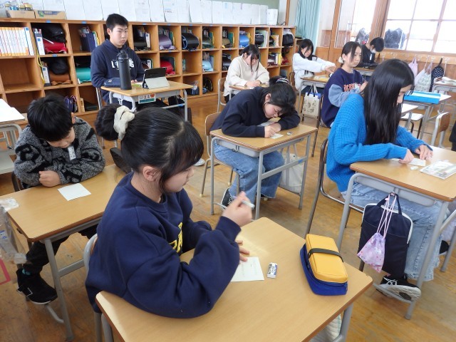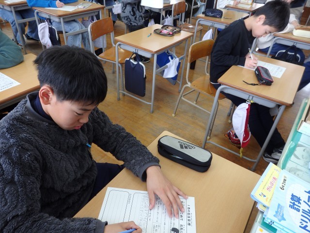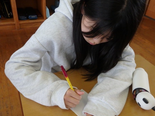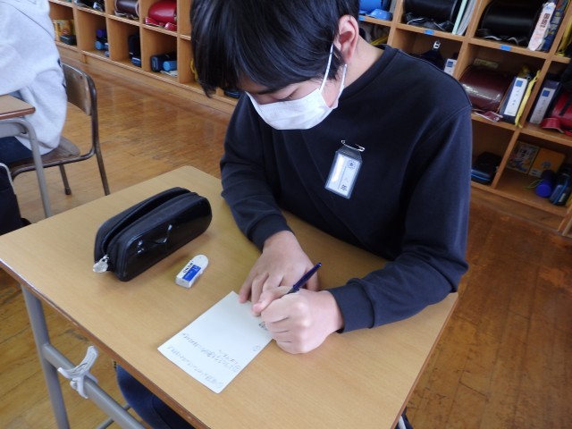 6年生は冬休みの課題やプリント類などが配られたり、お家の人への卒業文集の原稿依頼の手紙を書いたりしていました。原稿をお願いするだけでなく、これまで育ててくれた感謝の気持ちを一生懸命、丁寧に綴っていました。書いているところを見させてもらいましたが、とってもジーンとしてきました。気持ちがこもっていますね。