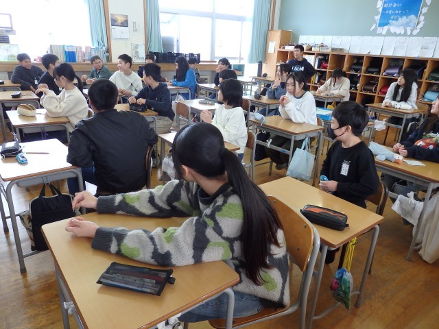 6年生の2時間目です。「私は誰でしょう?」クイズをしていました。周りの人に見えないようにして、1人1人がカードに「冬休みの出来事」「今年頑張りたいこと」「中学校で入りたい部活動」を書いて、先生に渡します。先生がランダムに引いたカードを読み上げ、それが誰かを当てていきました。「友だちの家に遊びに行ってご飯をごちそうになった」、「親戚とSWITCH2で遊んだ」、「ダンスをしていて・・・」などの冬休みの出来事が紹介されていました。中には「六高に入るために勉強を頑張る」と3年後を見据えている子がいました。