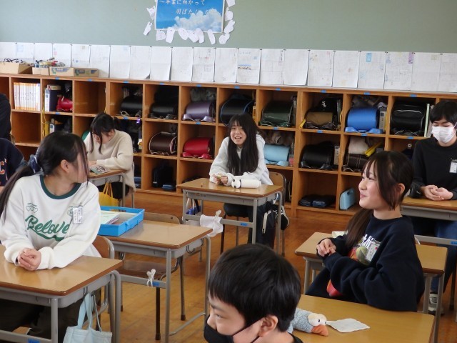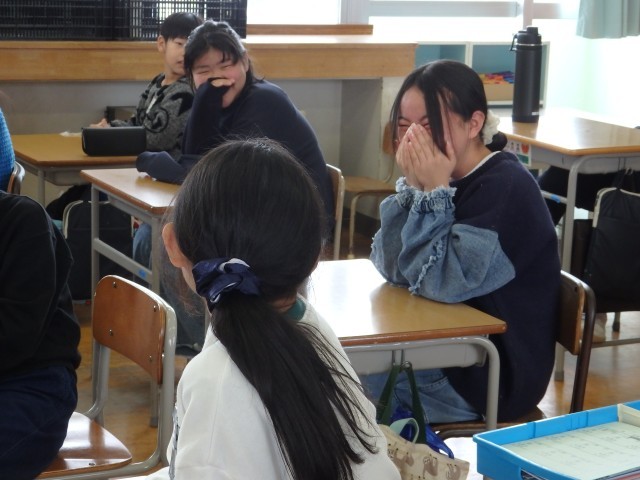 6年生の4時間目です。一足早く担任の先生からクリスマスプレゼントです。中身はシールと消しゴム。とてもうれしそうにお互いの袋に入っていた物を見せ合っていました。いい笑顔ですね。