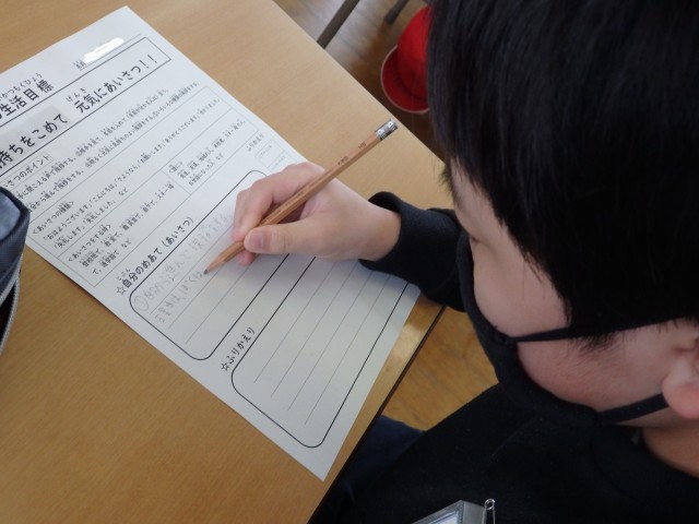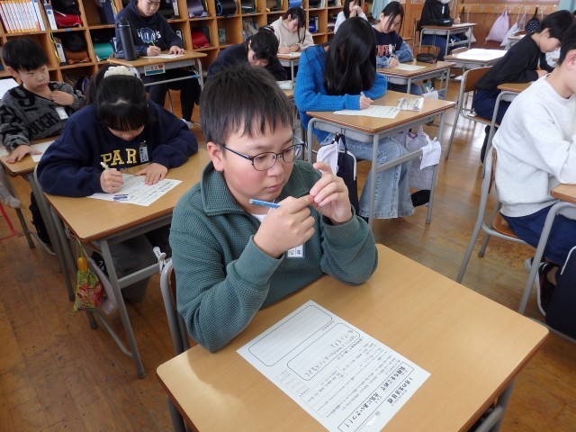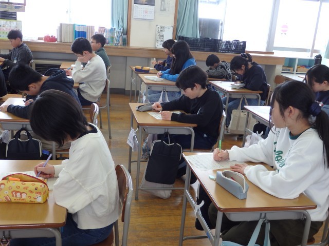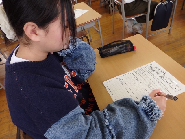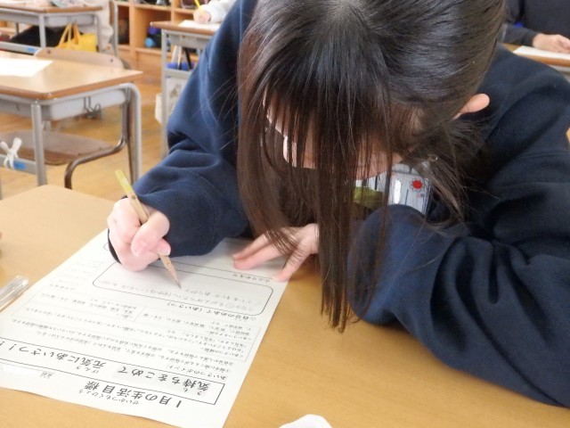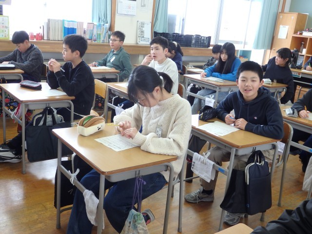 6年生の3時間目です。1月の生活目標「気持ちを込めて元気にあいさつ」に対する自分のめあてを考えました。「スキー授業ではスキー場の人にしっかりあいさつをする」、「通学路で地域の人に元気にあいさつをする」、「『おはようございます』や『ありがとう』だけでなく、いろいろなことばを使ってあいさつをする」、「相手の名前を付けてあいさつをする」など具体的に考えていました。「あいさつ世界一!」を目指して、まずは学校のリーダーである6年生からお手本を見せてほしいです。