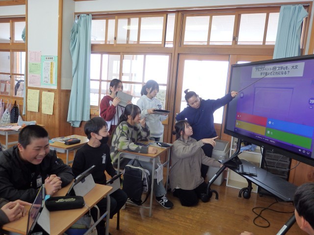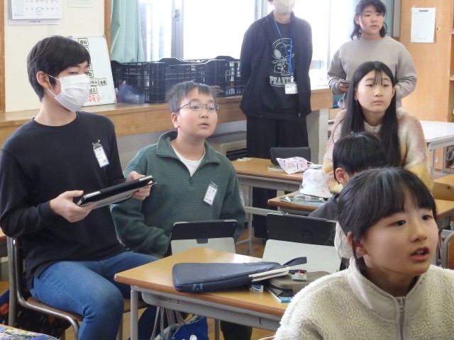 6年生の2時間目は国際科の授業でした。まずは、3学期最初の授業ですので、これまでどんな内容でどんな英語の学習をしてきたのかを振り返りました。iPadのクイズアプリ「カフート」を使って、1,2学期の復習のクイズ大会です。電子黒板に表示される問題を見て答えたり、1人1人のiPadに流れる英語の音声を聞いて答えたりしていきました。「この答えは○○だよ!」とわざと違う答えを言って、他の人を惑わせようとしている子がいました。