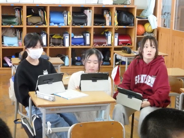 6年生の国際交流会でスピーチしている様子です。自分のお家がお店をしている子は自分の家を紹介していました。また、3人の国際大学生へのスピーチが終わった子は、一緒に来校していた市教育委員会の方へもスピーチをしました。