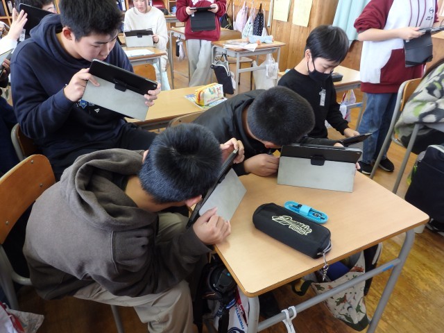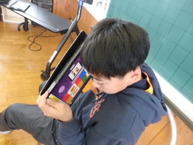 6年生の5時間目は国際科の授業でした。国際交流会のために一時中断していた「行きたい外国紹介」の学習です。復習のためにiPadのクイズ・アプリ「カフート」を使って、英語を聞き取る活動をしました。2人の人が「どこに行きたい?」「○○へ行きたい」というやり取りをしている場面を聞いたり、英語で流れる国名を聞いたりして、どこの国なのかを答えていきました。流れてくる音声に耳を澄ませて聞き、1問終わるごとに「しまったー!」「やった!」という声があちこちから聞こえてきました。