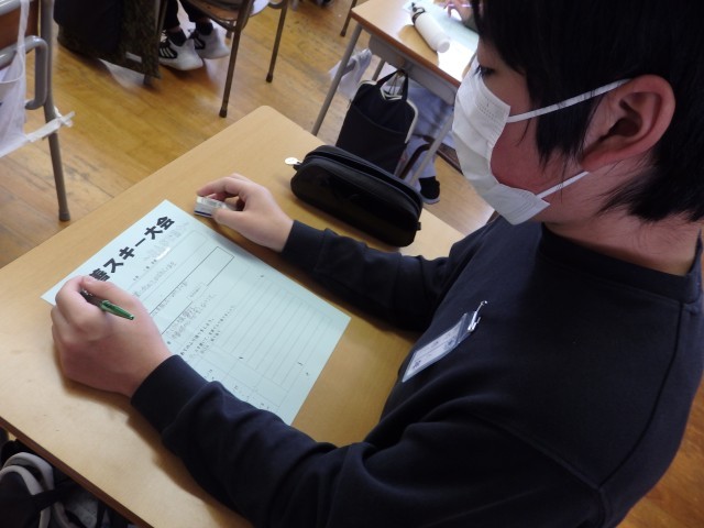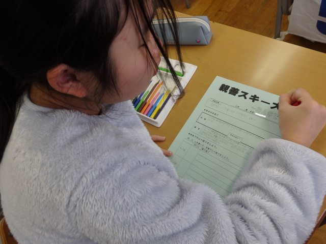 6年生の6時間目は総合の授業でした。2月6日に行われる親善スキー大会に向けてのめあてを立てていました。めあてだけでなく、めあて達成のためにあと4回のスキー授業でどのように取り組んでいくのかも考えました。とても具体的に書いている子が多く、中には小さい字でビッシリと書き込んでいる子がいました。明日のスキー授業からポールの練習が入ってくるのでしょうか。