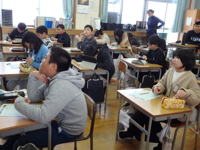 6年生の3時間目です。1月の生活目標「気持ちを込めて元気にあいさつ」に対する自分のめあてを考えました。「スキー授業ではスキー場の人にしっかりあいさつをする」、「通学路で地域の人に元気にあいさつをする」、「『おはようございます』や『ありがとう』だけでなく、いろいろなことばを使ってあいさつをする」、「相手の名前を付けてあいさつをする」など具体的に考えていました。「あいさつ世界一!」を目指して、まずは学校のリーダーである6年生からお手本を見せてほしいです。