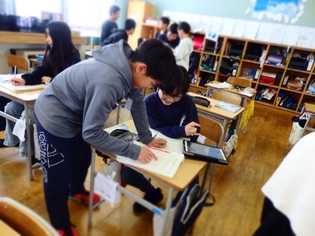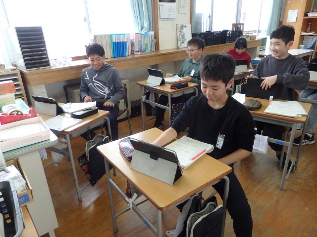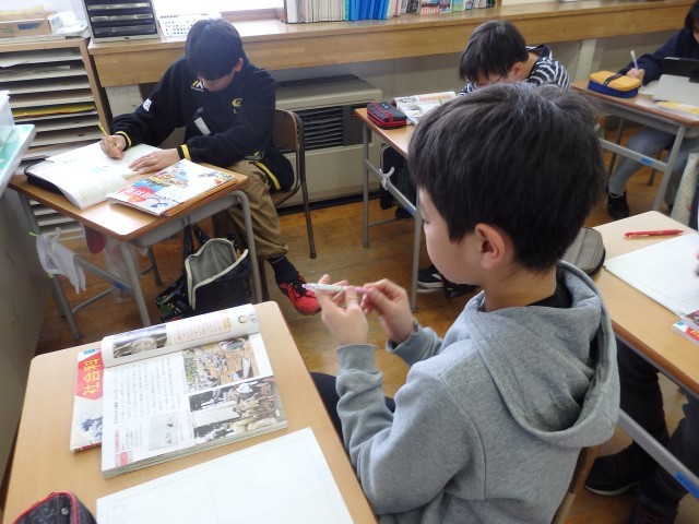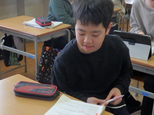 6年生の4時間目は国語の授業でした。「宇宙への思い」という評論文の学習です。ISS(国際宇宙ステーション」で5ヶ月間も働いた日本人の体験が書かれている文の読み取りをしていました。「ISSは90分で地球を1周する」というところから、「じゃあ、1日で地球を何周するのか」をさっそく計算している子がいました。また、文の中のポイントだと思う部分にマーカーペンで線を引いている子がいました。