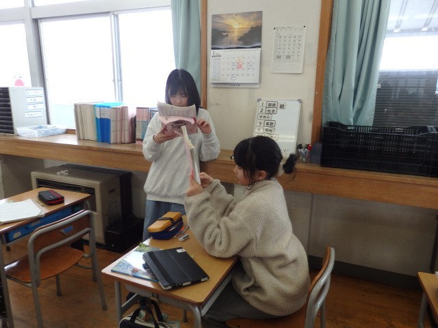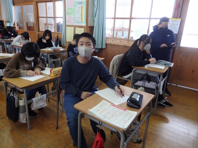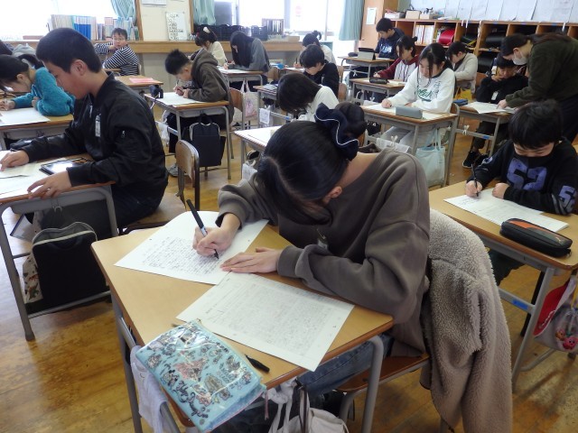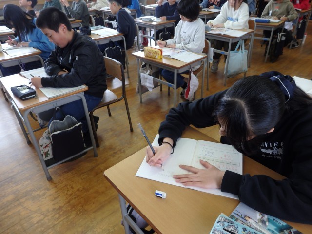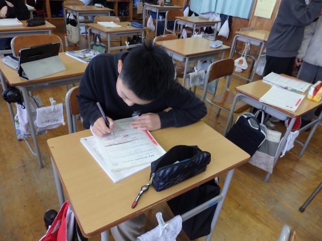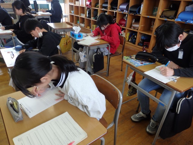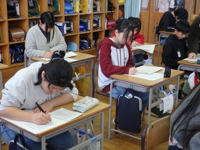 6年生は冬休みの課題やプリント類などが配られたり、お家の人への卒業文集の原稿依頼の手紙を書いたりしていました。原稿をお願いするだけでなく、これまで育ててくれた感謝の気持ちを一生懸命、丁寧に綴っていました。書いているところを見させてもらいましたが、とってもジーンとしてきました。気持ちがこもっていますね。