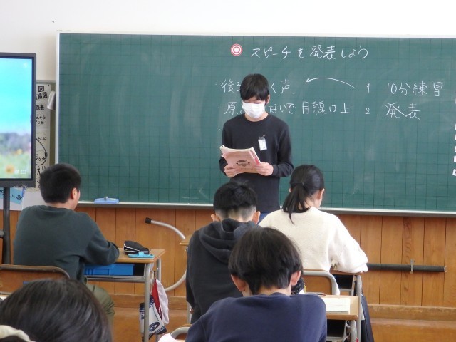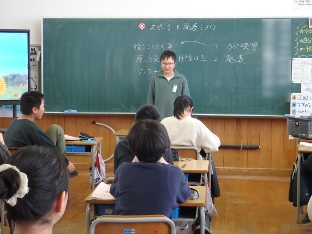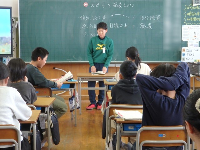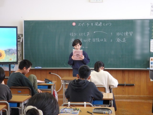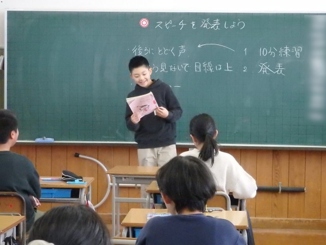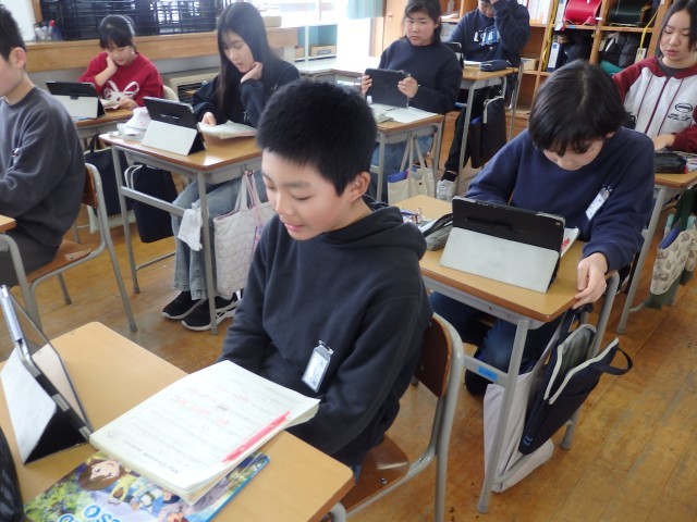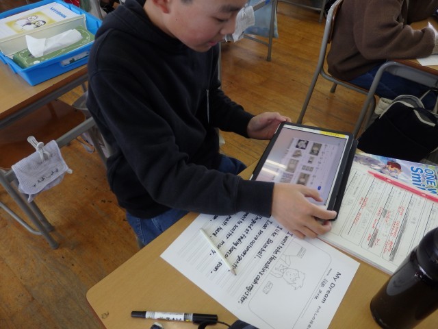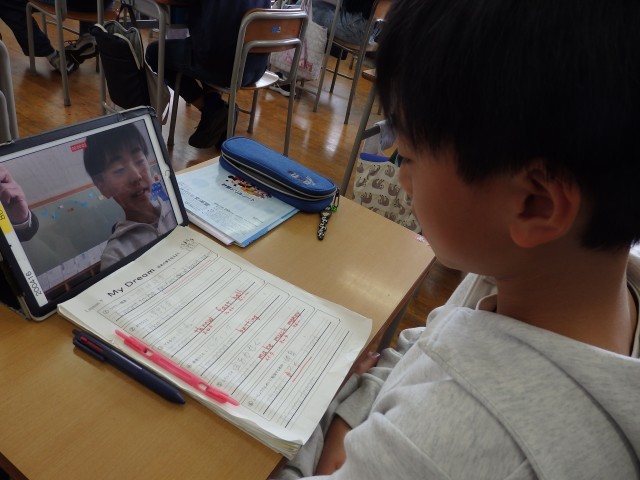 6年生の4時間目は国際科の授業でした。「将来の夢」についてのスピーチ練習です。自分が将来、就きたい職業とその理由、そのために何の教科の勉強を頑張るかなどについてスピーチをします。スラスラ言えるように1人で練習したり、友だちに聞いてもらって練習したりしました。最後にリハーサルを兼ねてiPadに自撮りでスピーチ動画を撮影し、オクリンクで先生に提出しました。