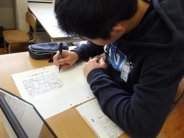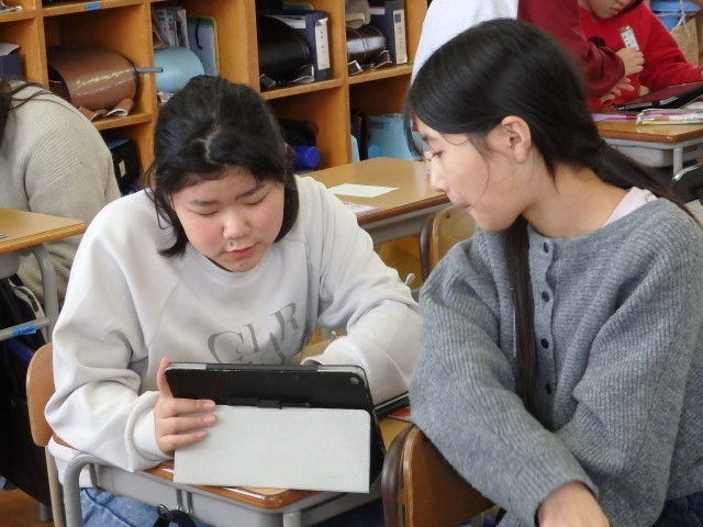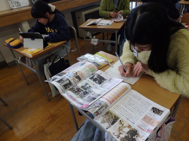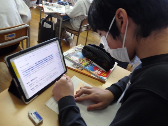 6年生の4時間目は社会の授業でした。「戦争中の人々の暮らし」についての学習です。教科書や資料集を読み込んだり、iPadを使って調べたりして、日中戦争や太平洋戦争の頃の人々の暮らしはどのようなものだったのかノートにまとめていました。書かれていることを正しく読み取り、全部書くのではなく大事なポイントを押さえて自分のことばでまとめることが大切です。