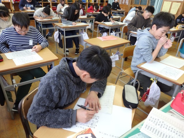 6年生の1時間目は学活の授業でした。卒業文集の清書をしていました。「6年間の思い出」と「将来の夢」についてです。どの子も無言で清書に集中していました。6年間の思い出では修学旅行、自然体験教室、運動会が多いようです。お子さんの6年間の思い出は何でしょうか。