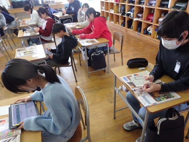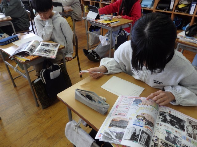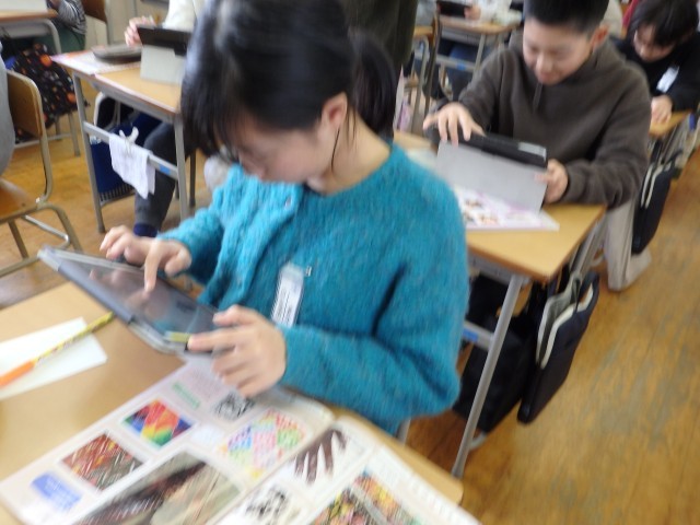 6年生の5時間目は図工の授業でした。今日から版画の学習です。思い出の場面での自分の姿を大きく描きます。初日の今日はどんな場面にするか題材選びです。学校ホームページで良い場面を探しました。金の延べ棒を持っているところ、海岸の散歩、イカ裂き体験、砂金取り、カニを食べているところなど修学旅行を選んでいる子が多かったようです。どんな名場面が描かれるのでしょうか。