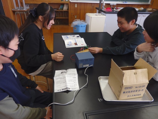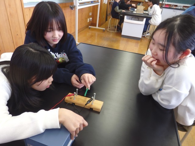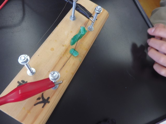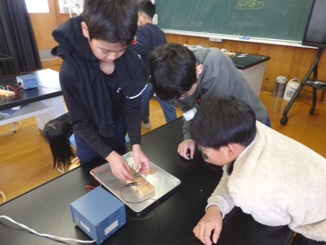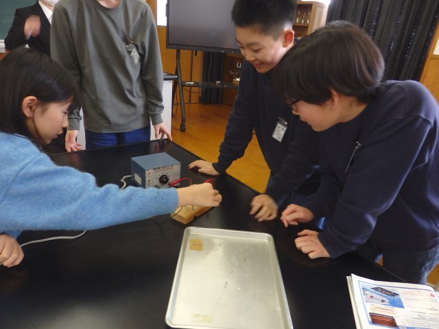 6年生の3時間目は理科の授業でした。他校の先生や市の指導主事が参観しての授業でした。「電流」の学習です。電流を通した電熱線にみつろうそくを当てるとどうなるか実験していました。ろうそくが溶けていく様子を目を輝かせて見つめる表情がいいですね。