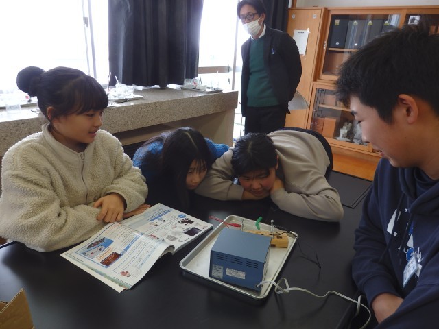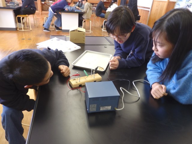 6年生の3時間目は理科の授業でした。「電流」の学習です。『NECOライト』という模型キットを使って、「回路につなぐ物によって電気が使える時間が違うのはなぜか」を確かめる実験をしていました。模型キットのハンドルを回すと、コンデンサーに電気がたまり、ライトを光らせたり、車のように走ったり、ブザーを鳴らしたりできます。光るライトや走って行く車をじーっと観察していました。