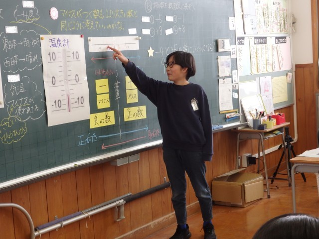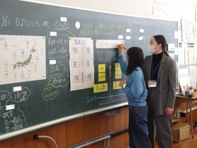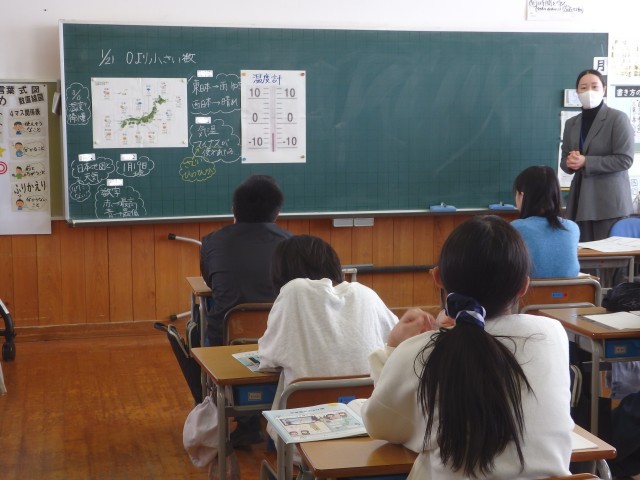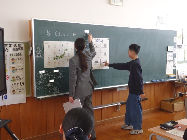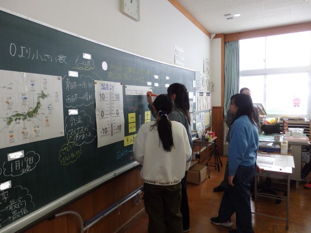 6年生の4時間目は算数の授業でした。他校の先生や市の指導主事が参観しての授業でした。「0より小さい数」の学習です。まず、全国の天気や最高・最低気温が書かれた地図が示され、子どもたちは気付いたことを発表していきました。その中で「最低気温でマイナスが使われている」「氷点下で寒い」といった考えが出さ、「マイナスの付いた数字とプラスが付いている数字」について学習しました。-5や+3等の数字が数直線上のどこになるのか考えたり、-4と+5の差がいくつになるのかを考えたりしました。正の数、負の数は中学1年生の最初に学習する内容です。今日学んだ内容を身に付けて、中学校での学習につなげていってほしいです。
