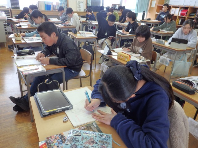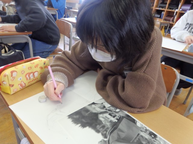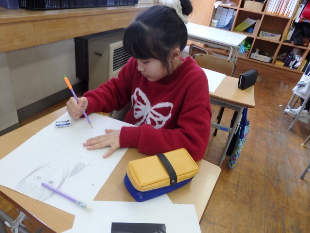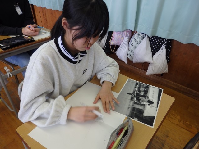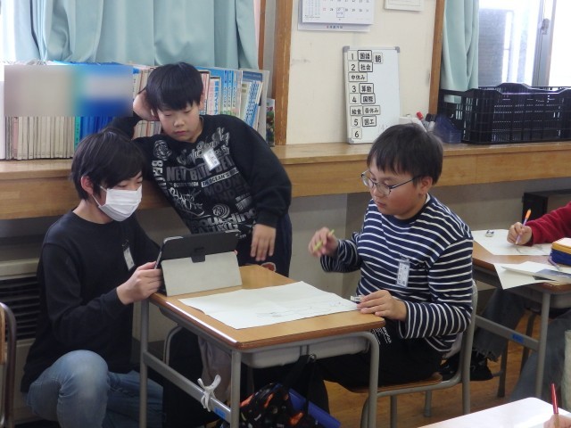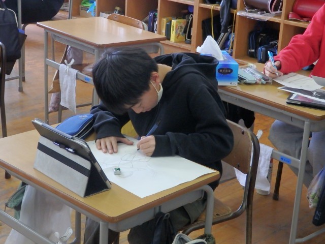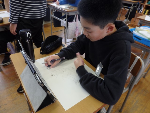 6年生の5時間目は図工の授業でした。思い出の瞬間を版画で表現します。今日は下書きとして紙に絵を描いていました。iPadで学校HPを見ながら描いたり、先生からプリントアウトしてもらった写真を見ながら一生懸命描いていました。「顔を描くのが難しい!」「バランスが・・・」と苦戦していました。