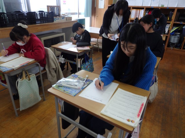 6年生の2時間目は国際科の授業でした。まずは前回の続きで、「将来の夢」についての作文を清書しました。丁寧に英文を書いて、絵も色を塗っていました。お子さんがどんなことを書いたのか卒業式当日、控え室にてご覧ください。後半は単元のまとめのテストと振り返りをしました。