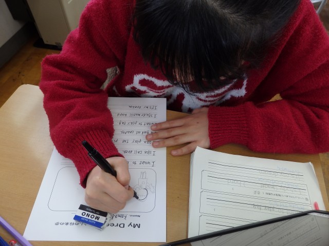 6年生の国際科の続きです。「将来の夢」についてのスピーチ原稿を基に英文を清書したり、自分がその職業で働いている絵を描きました。書いたものは卒業式当日、保護者控え室に掲示します。お子さんがどんなことを書いたのかぜひお読みください。一人一人がじっくり丁寧に書いていました。