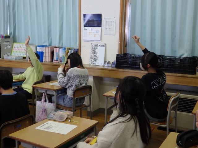 6年生の4時間目は国語の授業でした。「宇宙への思い」という評論文の学習です。ISS(国際宇宙ステーション」で5ヶ月間も働いた日本人の体験が書かれている文の読み取りをしていました。「ISSは90分で地球を1周する」というところから、「じゃあ、1日で地球を何周するのか」をさっそく計算している子がいました。また、文の中のポイントだと思う部分にマーカーペンで線を引いている子がいました。