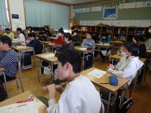 6年生の4時間目は国語の授業でした。前の授業で行った「学力定着確認テスト」の自己採点を行っていました。問題を見せてもらいましたが、かなりの長さの文章を読んで、あとの問いに答える問題ばかりでした。長い文章を読んで内容を捉える力、問題文で何が問われているのかを正しく理解する力、そして何より長い文章でも頑張って読み切ろうとする気持ちが大切です。後半は「宇宙への思い」の単元のまとめのプリントに取り組みました。