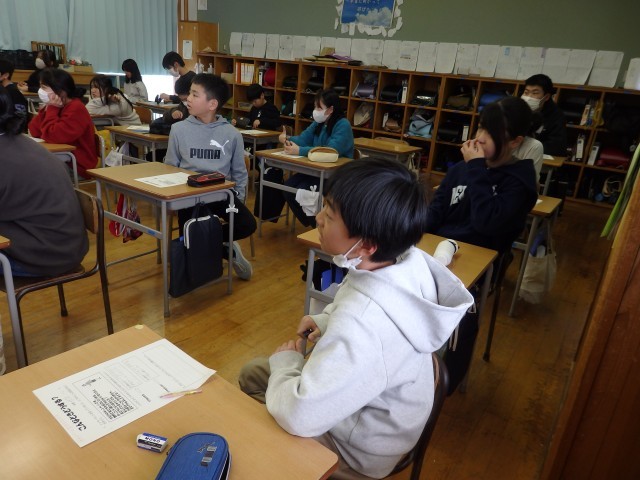 6年生の1時間目は総合の授業でした。「南魚沼市への提言」を考えました。「これからの南魚沼市にどうなってほしいか」「何が必要か」、「そのためにどうすればいいのか」、「自分はどうするのか」について考えました。「大きなショッピングモールを作ってほしい。そして、今の南魚沼市は高齢者で車を持っていない人が多いので、バスや電車の本数を増やしてほしい」、「公共施設などを整え、誰もが過ごしやすい南魚沼市にしてほしい」、「南魚沼市の米を使った新商品を開発したらどうか。農業をしている人は高齢の方が多いので、ポスターなどで求人したり、小学生が体験できるようにしたらどうか」、「大人も子どもも体を動かして楽しめる施設を作ってほしい」、「壊れかけの家を整備したり、空き家を民泊施設として利用できるようにしたらどうか」など、思わず「なるほど!」と思う意見がたくさんありました。これらの提言は来週月曜日の学校運営協議会で委員の皆様に発表します。協議会には県や市の議員さんもいらっしゃるので、いい提言の場になると思います。