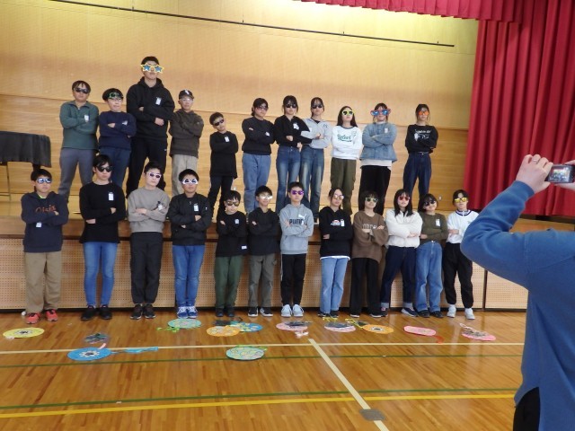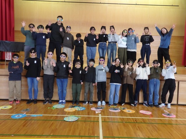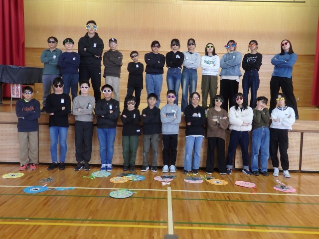 体育館へ戻ってきた6年生。みんなでサングラスを付けて集合写真です。写真を撮ったら整列して、5年生へ「ありがとうございました!」とお礼の言葉。学校のリーダーのバトンタッチの瞬間です。