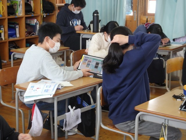 6年生の5時間目は理科の授業でした。市理科センターの方を講師として「プログラミング授業」を行いました。自動車用信号を青→黄色→赤と切り替わるようにしたり、歩行者用信号を横断歩道を渡っているお年寄りが渡りきれるように青信号が点滅して赤に変わるようにしたりするプログラミングを行いました。赤と青が同時に光ってしまったり、お年寄りがまだ半分しか渡っていないのに赤になってしまったりしていましたが、無事、全員が正常にプログラミングできたようです。