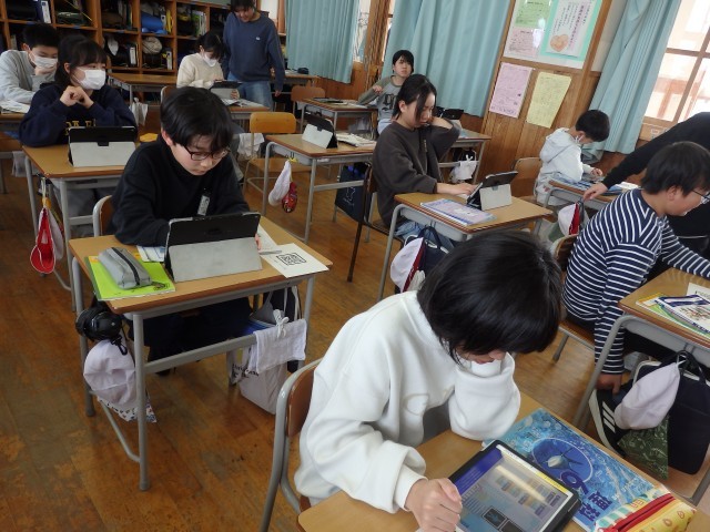 6年生の1時間目は国語の授業でした。「宇宙への思い」の学習です。「はやぶさ」や「はやぶさ2」の役割、小惑星「リュウグウ」と「イトカワ」の大きさや特徴など、内容の読み取りをしていました。教科書のどこに書かれているかを見つけ、線を引いて、ノートに書き出していました。南魚沼市の全ての小中学校で取り組んでいる「読む力」の中の「正しく読む力」の指導です。