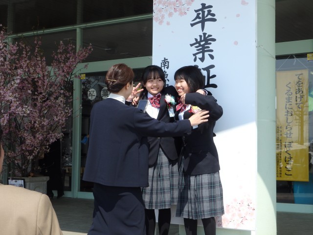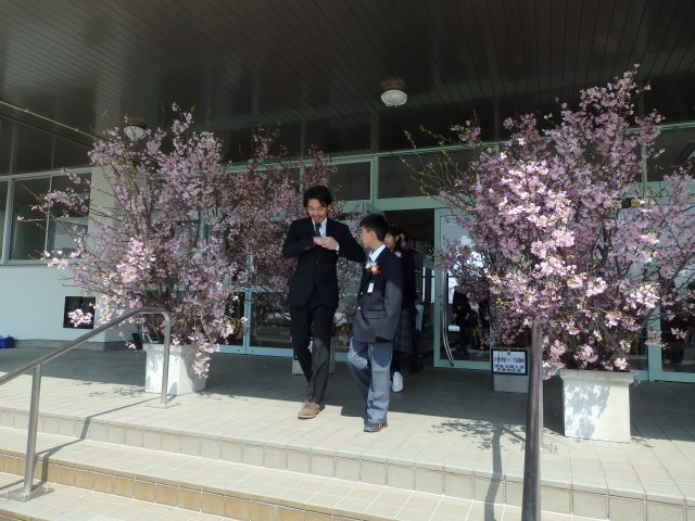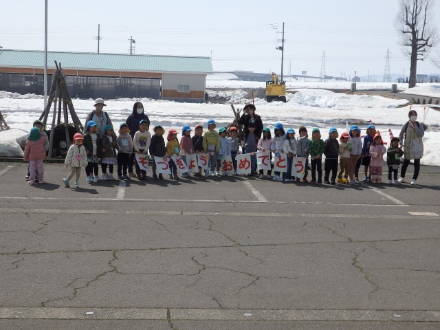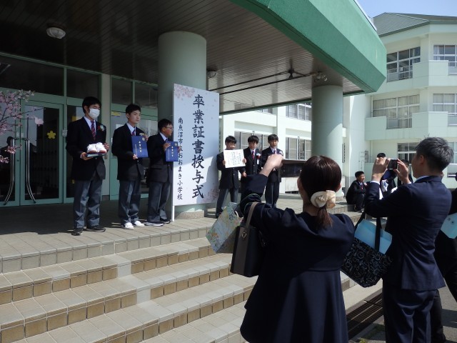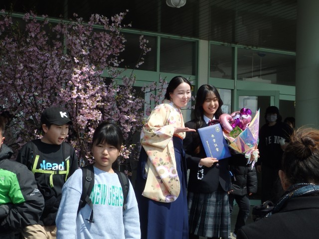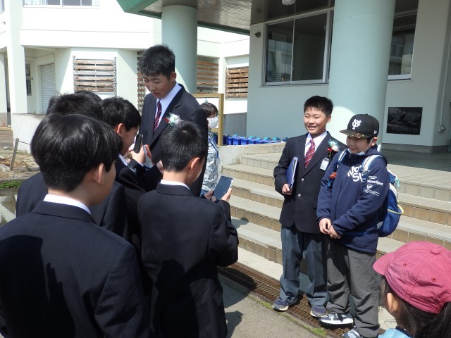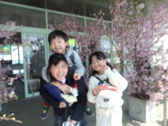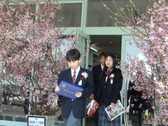 今朝もご紹介しましたが、商工会の皆様から寄贈していただいた桜の花道を通って学校の外へ。いい天気で日差しも温かく、友だちや在校生たちと別れを惜しむ卒業生でした。そして、玄関前には近くの保育園の園児たちが卒業のお祝いに来てくれていました。
