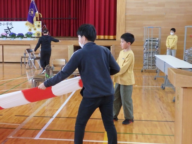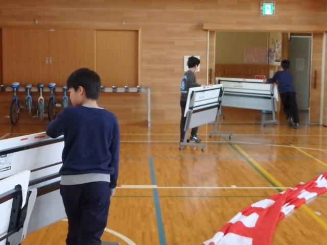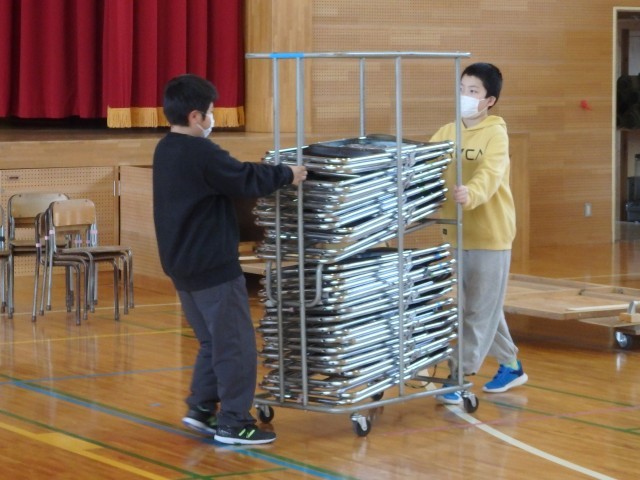 4時間目に6年生が入学式の後片付けをしてくれました。一つの仕事が終わって手が空くと、自分で別の仕事を見つけたり、他の子の手伝いをしたりと、みんなで協力して、一生懸命に片付けをしてくれました。おかげであっという間に片付けが完了しました。6年生、さすがです!
