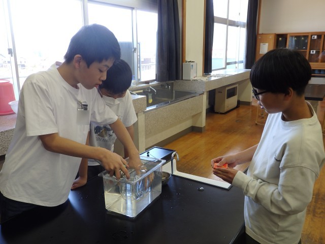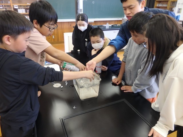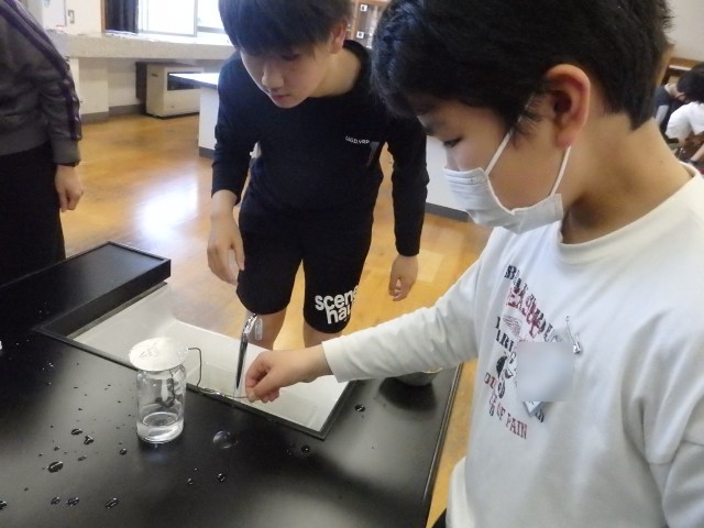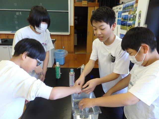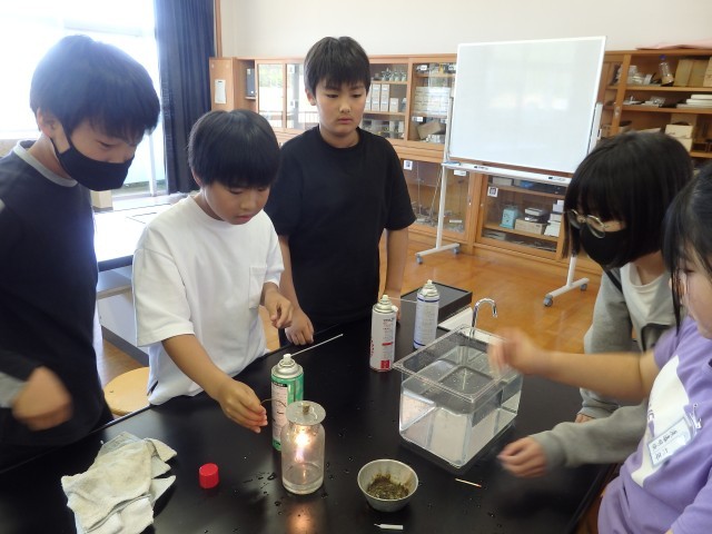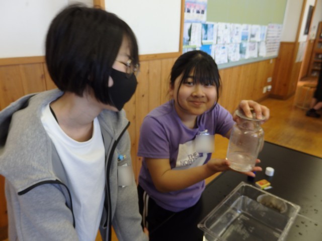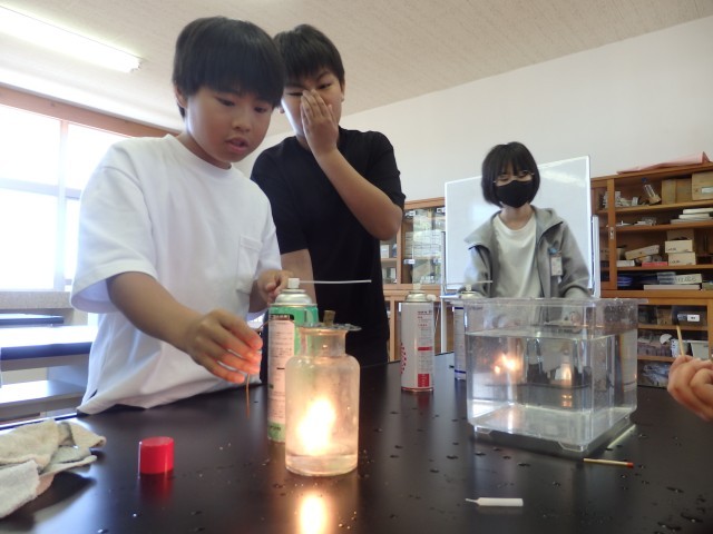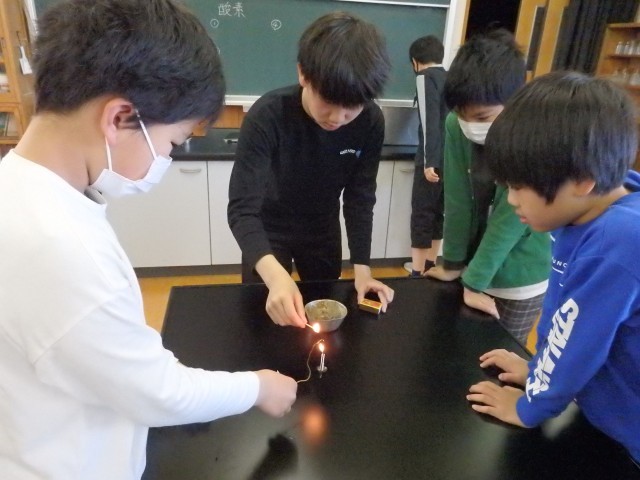 6年生の2時間目は理科の授業でした。「物の燃え方」の学習で、実験を行いました。酸素、二酸化炭素、窒素をビンの中に集めて、その中に火のついたローソクを入れます。気体によって、ビンの中に入れた瞬間に火が消えてしまったり、ゴォーと激しく燃え上がったりするのを目を輝かせて見ていました。実験だけでなく、器具の準備なども協力して行っていました。
