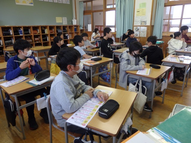 6年生の5時間目は学活の授業でした。ソーシャルスキルトレーニングとして「以心伝心ゲーム」を行っていました。ルーレットで選ばれた子が、みんなに見えないように「好きな食べ物」や「行ってみたい国」などの答えをホワイトボードに書きます。他の子たちは6チームに分かれて、その人が何て書いたのかを2回ずつ質問して予想します。チームで話し合ったり、意見を出し合ったりしながら協力して取り組んでいました。
