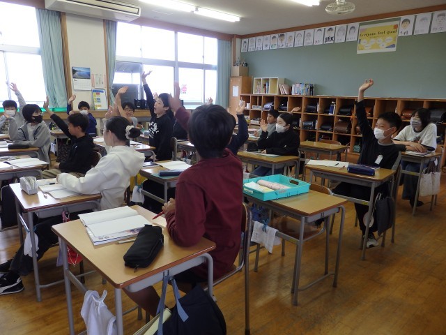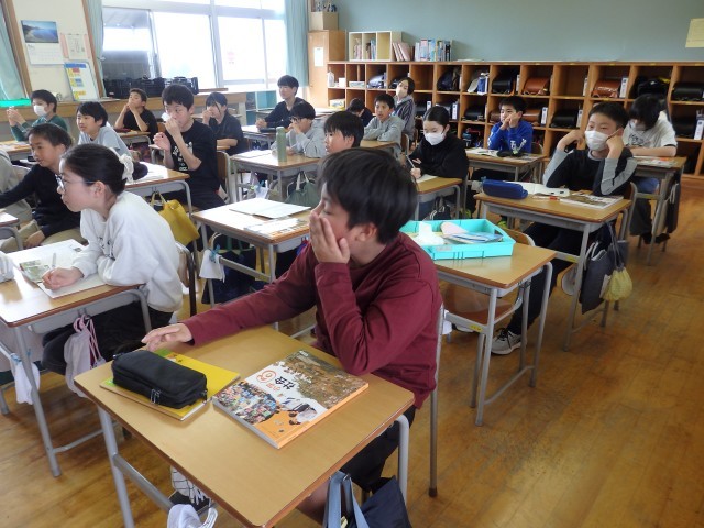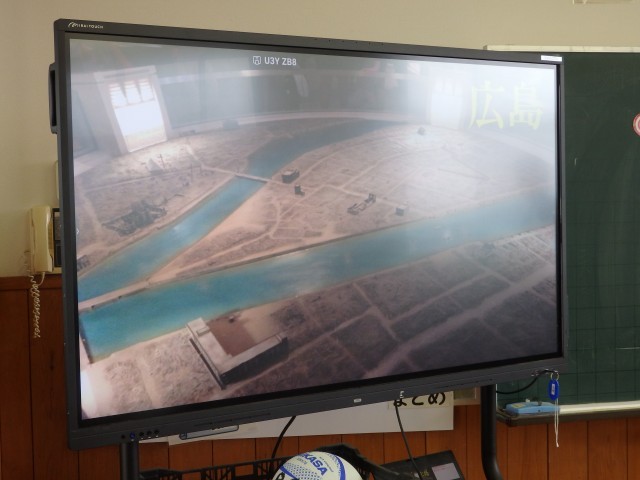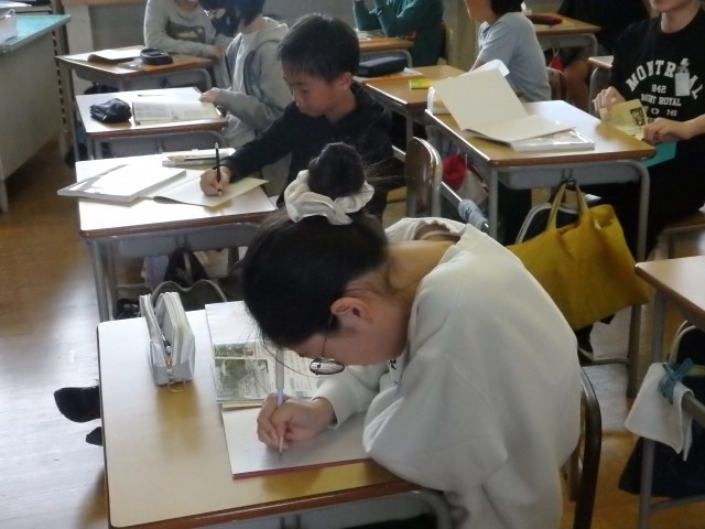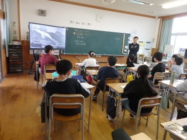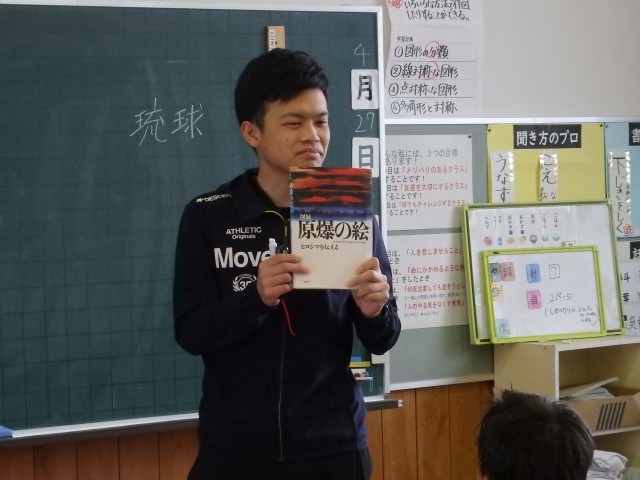 6年生の5時間目は社会の授業でした。「憲法と私たちの暮らし」の学習です。スライド資料を使って「憲法第9条 平和主義」について学習していました。戦争で上陸された沖縄や原爆の被害に遭った広島の写真を見たり、先生が実際に原爆記念館で見聞きしてきたことの話を聞いたりなどしていました。その上で「交戦権」「集団的自衛権」などの用語を学びました。先生が持っている「原爆の絵」という本に子どもたちの目が食いついていますね。