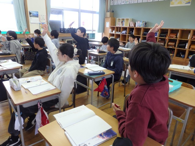 6年生の4時間目は国語の授業でした。「たずねてみよう」という学習です。話し合いをするときのポイントとして「相づちをうつ」「相手の意見を聞く」「相手の目を見て聞く」の3つと更に相づちの言葉「さしすせそ」を確認しました。その後、ペアになって「何のために国語を勉強するのか」ということについてたずね合いました。最後に先生と1人の子でデモンストレーションを行いました。さて、何のために国語を勉強するのでしょう。