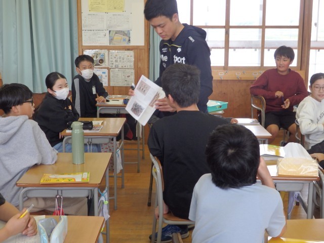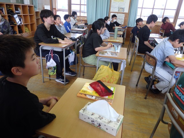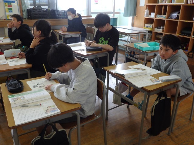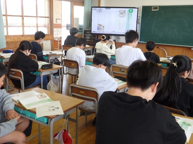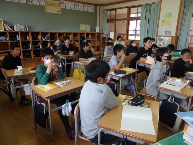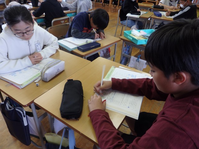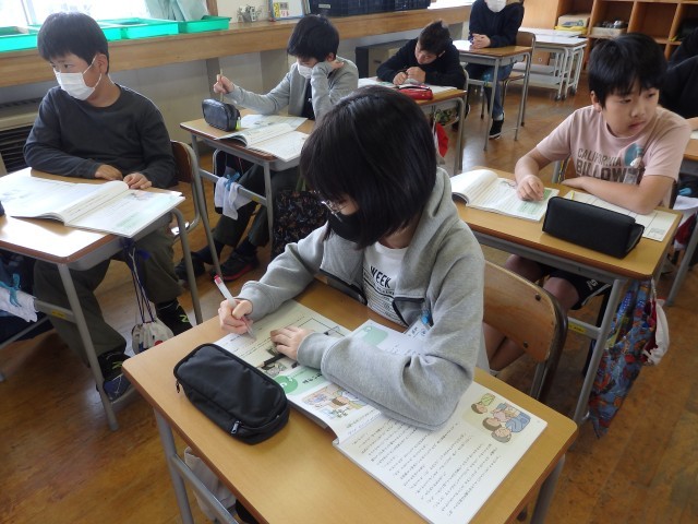 6年生の1時間目は国語の授業でした。「さなぎたちの教室」の学習です。みんなで丸読みをしていました。他の人が読んでいるときに、どこを読んでいるか分からなくならないように、指で文字を追っている子がいました。スムーズに丸読みが進んでいきました。さすが6年生です。