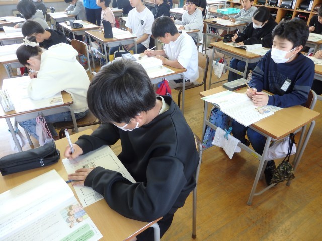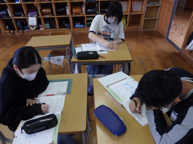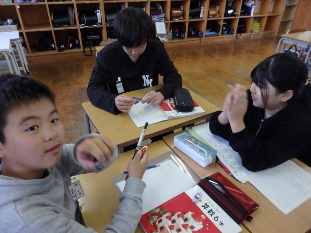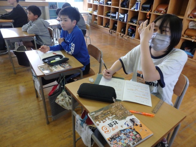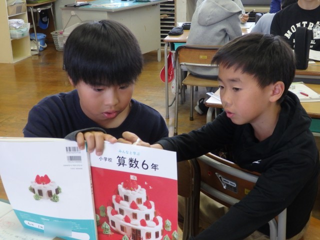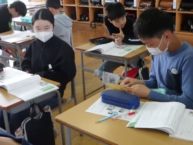 6年生の3時間目は算数の授業でした。「線対称」の学習です。線対称の図形にはどんな性質があるのか考えました。まとめの問題として直線で作られたハート型のような図について対角線の長さやある点に対応する点などを求める問題に取り組みました。教え合いながら集中して取り組んでいました。おおまき小はこれまで実施してきた諸検査の結果によると図形が弱点の一つです。分からないところをそのままにせず、身に付けてほしいです。
