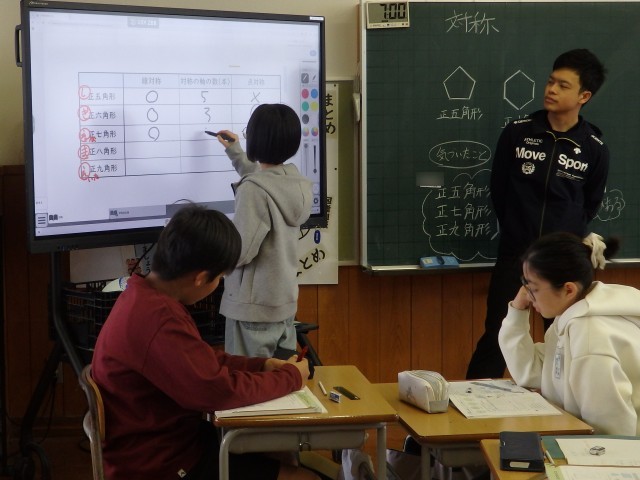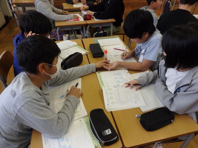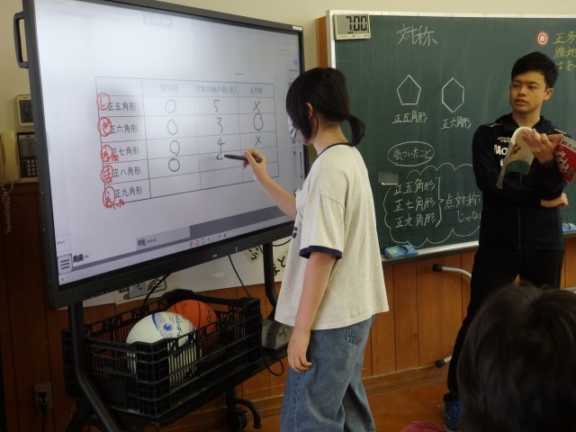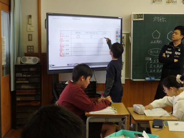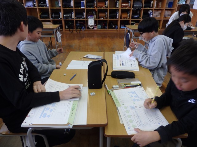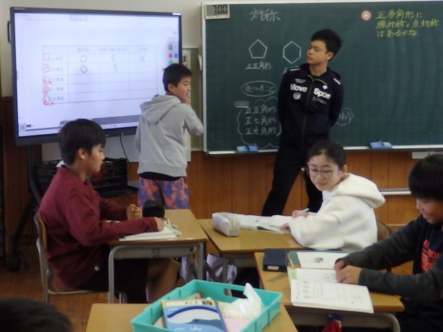 6年生の2時間目は算数の授業でした。「対称」の学習です。正五角形~正九角形までの正多角形が「線対称か点対称か」、「線対称なら対称の軸となる線は何本か」を班ごとで考えました。班の人はもちろん、他の班の人とも相談しながら取り組んでいました。