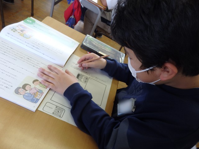 6年生の1時間目は道徳の授業でした。「温かいおまんじゅう」ちう資料を読んで、【本当の礼儀】について考えました。資料は「主人公の家におじいちゃんとおばあちゃんが遊びに来ました。お土産におまんじゅうをもらった主人公はゲームをしながら「ありがとう」と言いました。それを見たおじいちゃんは「礼儀を知らないなぁ」とつぶやきました。底に隣の家のさおりさんがやって来て・・・」という内容です。2人の登場人物の「ありがとう」の違いを考えることで、あいさつや感謝の気持ちを伝えるときにどんなことに気を付けたらいいか改めて考えました。