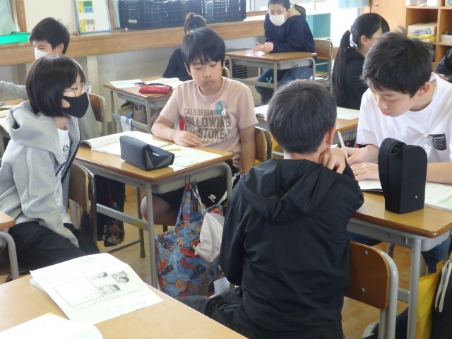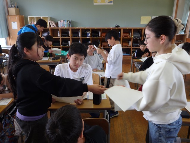 6年生の1時間目は道徳の授業でした。列ごとにリレー形式で1枚の絵を完成させる活動をしていました。ただし、自分が何を描いたのか教えてはいけません。「楽しい授業の様子」「未来の世界」などのテーマに沿って描きます。自分のところに回ってきた絵を見て「え~、これ何?」と言って何を描こうか悩む子、他の子が何を描くのかニコニコ笑顔で見守る子など、みんな楽しく取り組んでいました。