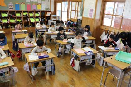 3限、1年生は道徳「くりのみ」の学習。