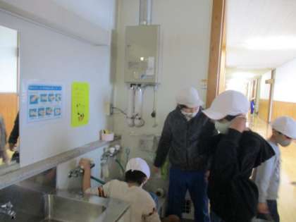おおまき小学校は、大巻中学校時代からの湯沸かし器があり、お湯を使って清掃ができます。