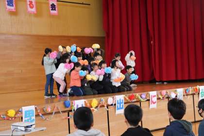 6年生からは「ももたろう」をもとにした劇「おおまき小学校在校生へのメッセージ」が披露されました。