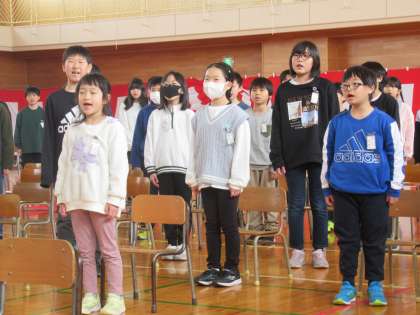 呼びかけの声、「君が代」「大空を迎える朝」「校歌」の歌声、きちっとした態度で、これまでお世話になった6年生に感謝の気持ちを伝えていました。