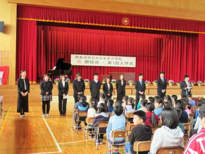 はじめて、全校で校歌を歌いました。体育館に歌声が響き渡りました。 -