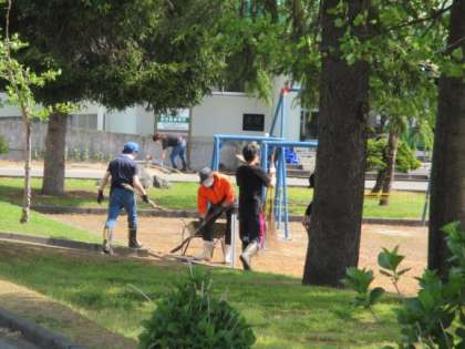 側溝の泥上げ、グラウンドの石拾い、プールのフェンスの設置・プール内の掃き掃除、畑の整備等をしていただきました。