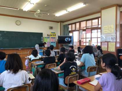9月2日の1時間目は下学年、2時間目は上学年対象に、校歌の作詞作曲者の今成満先生から、校歌に込めた思いをお話しいただきました。