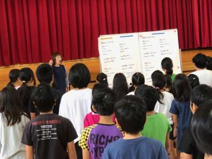 最後に、下学年は学習発表会で歌う地球のどこかでを、上学年は校歌を今成先生と一緒に歌って終わりにしました。