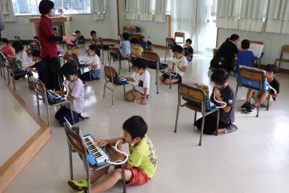 「音を出すものには何があるか?」という発問からスタート、タンバリン、たいこ、鈴、リコーダーなど、様々な楽器が意見として出てきました。「たたいて音が鳴るもの」「たたかないで音が鳴るもの」に分類をしました。音を出すものには何か共通点はないかと、実際に音楽室に行って楽器で音を鳴らしてみました。