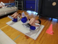1年生の3時間目は体育の授業でした。第2体育館で行いました。寝転がったところから「よーい、ドン」でスタートダッシュの練習をしたり、アザラシのようになって腕だけで前へ進む運動を行いました。