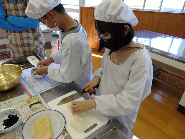 5年生の調理実習。野菜を切って下ごしらえです。大根、ねぎ、油揚げを切って下ごしらえです。煮干しから出しがとれたら、鍋から煮干しを取り出しました。包丁を使うのがとても上手な子がいました。